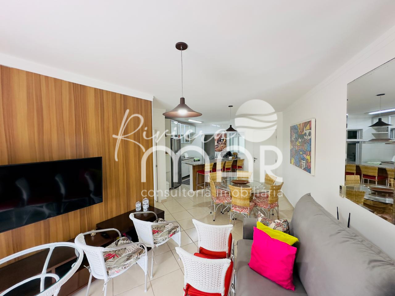 Apartamento mobiliado, 3 dormitórios sendo 1 suíte, armários embutidos, ar condicionado, living para 2 ambientes, cozinha americana completa, área de serviço, banheiro social, 98 m² de área útil e 2 vagas de garagem sendo uma delas com carregador elétrico.